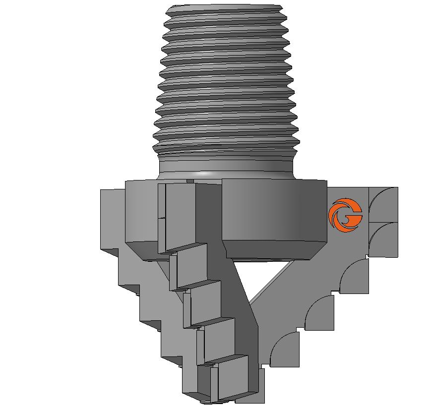 Ступенчатая форма режущей кромки долота под углом 70⁰, обеспечивает устойчивое разрушение забоя скважины в виде крупных кусков горной породы наличия дополнительных плоскостей обнажения, что обеспечивает высокую скорость бурения и быстрое удаление разрушенной породы с забоя.